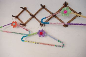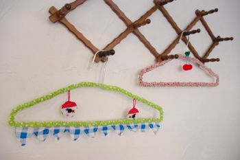 ファッブリックが縫い付けてあるハンガー。花やさくらんぼなどのポイントになるモチーフがなんとも可愛らしいです。