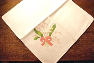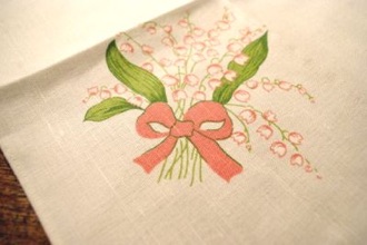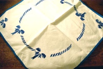 リボンつきのブーケのイラストが可憐なクロスです。大判のハンカチサイズなのでドイリーとしても。