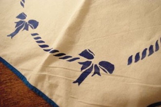 ハンドメイドでプリントされた鮮やかな青のリボン模様と縁取りが目をひくデザイン。ヘルシンキの蚤の市で見つけたものです。