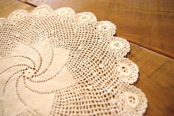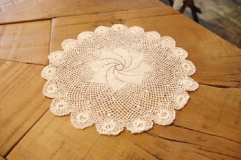 風車のようなモチーフのレースのドイリー。周囲に編み込ま