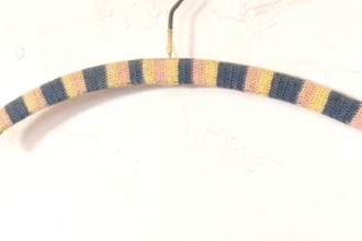ブルー、ピンク、オフホワイトの毛糸で編まれたカバーがついたハンガー。