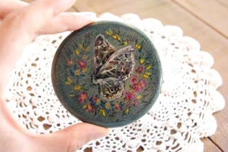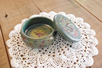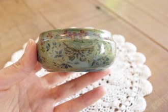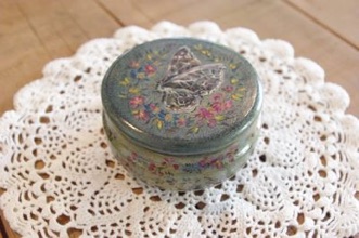 深いグリーン地にリアルな蝶や花が描かれた木製の小物入れ。宝物を入れたくなるようなロマンティックな雰囲気です。