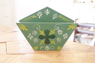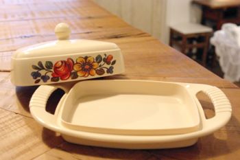 ベージュ地にレトロな花模様が東欧らしいバター入れ。ケーキやクッキーなどを入れてテーブルに置いても。