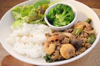 海老と挽肉とバジルのオイスターソース炒め